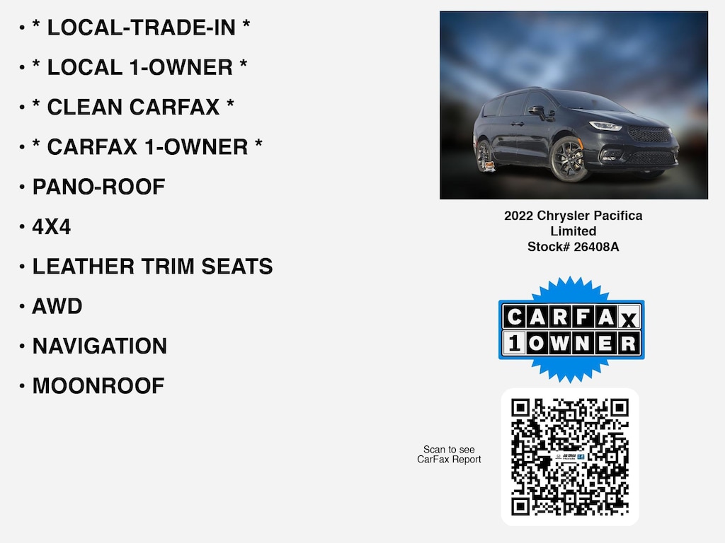 Please call 419-740-4925 anytime! for more info on this 2022 Chrysler Pacifica Limited. This vehicle for sale is packed with premium features like * CARFAX 1-OWNER *, * LOCAL-TRADE-IN *, * LOCAL 1-OWNER *, * CLEAN CARFAX *, PANO-ROOF, NAVIGATION, MOONROOF, AWD, LEATHER TRIM SEATS, 4X4, 360 CAM, APPLE CARPLAY, 3RD ROW SEAT, COOLED SEATS, WIRELESS PHONE CHARGER, HEATED SEATS, REMOTE START, HEATED-REAR SEATS, ANDROID AUTO, LANE-DEPARTURE WARNING, 2ND ROW CAPTAINS CHAIRS, BLIND SPOT MONITORING, BACKUP CAMERA, HEATED-STEERING WHEEL, ALLOY-WHEELS, HOMELINK, BACKUP-SENSORS, STOW "N GO, BLUETOOTH, WiFi Hotspot, Remote entry, Fog Lamps, SiriusXM, Dual Power Seats, usb that Toledo and Perrysburg drivers expect.
