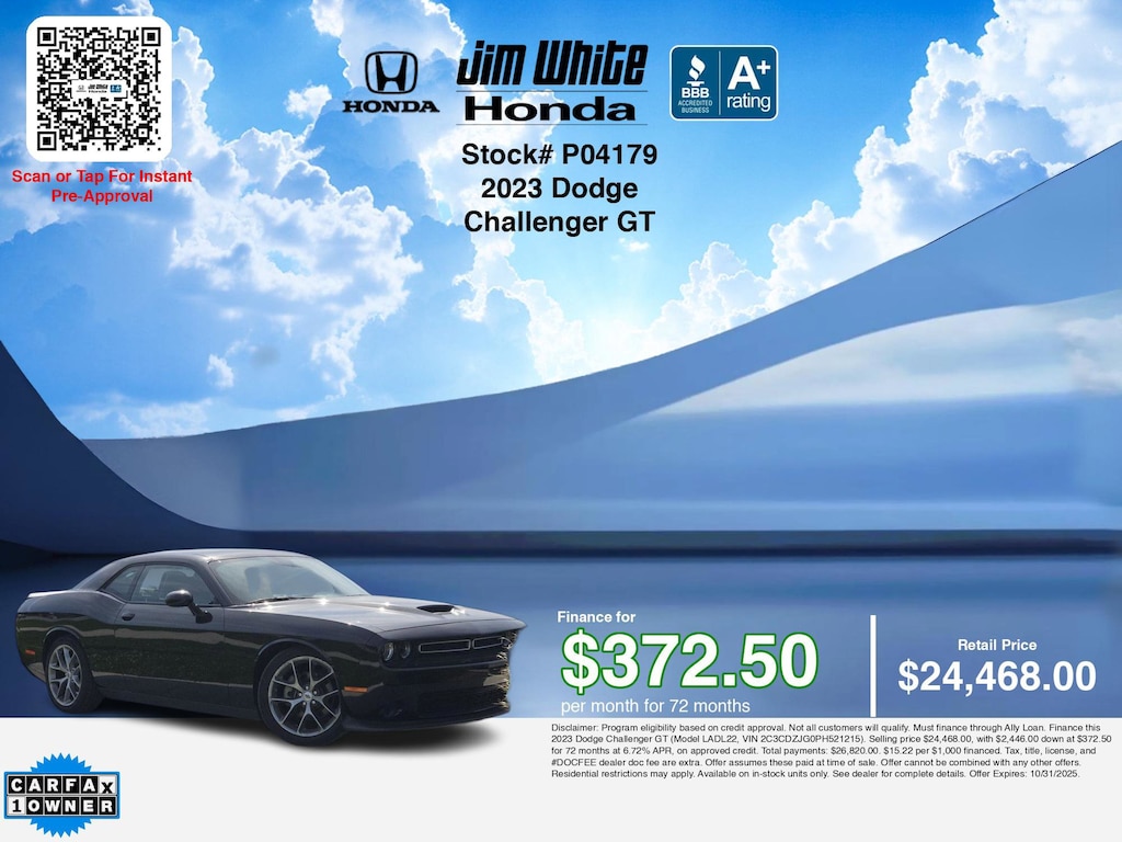 Disclaimer: Disclaimer: Program eligibility based on credit approval. Not all customers will qualify. Must finance through Ally Loan. Finance this 2023 Dodge Challenger GT (Model LADL22, VIN 2C3CDZJG0PH521215). Selling price $24,468.00, with $2,446.00 down at $372.50 for 72 months at 6.72% APR, on approved credit. Total payments: $26,820.00. $15.22 per $1,000 financed. Tax, title, license, and #DOCFEE dealer doc fee are extra. Offer assumes these paid at time of sale. Offer cannot be combined with any other offers. Residential restrictions may apply. Available on in-stock units only. See dealer for complete details. Offer Expires: 10/31/2025.