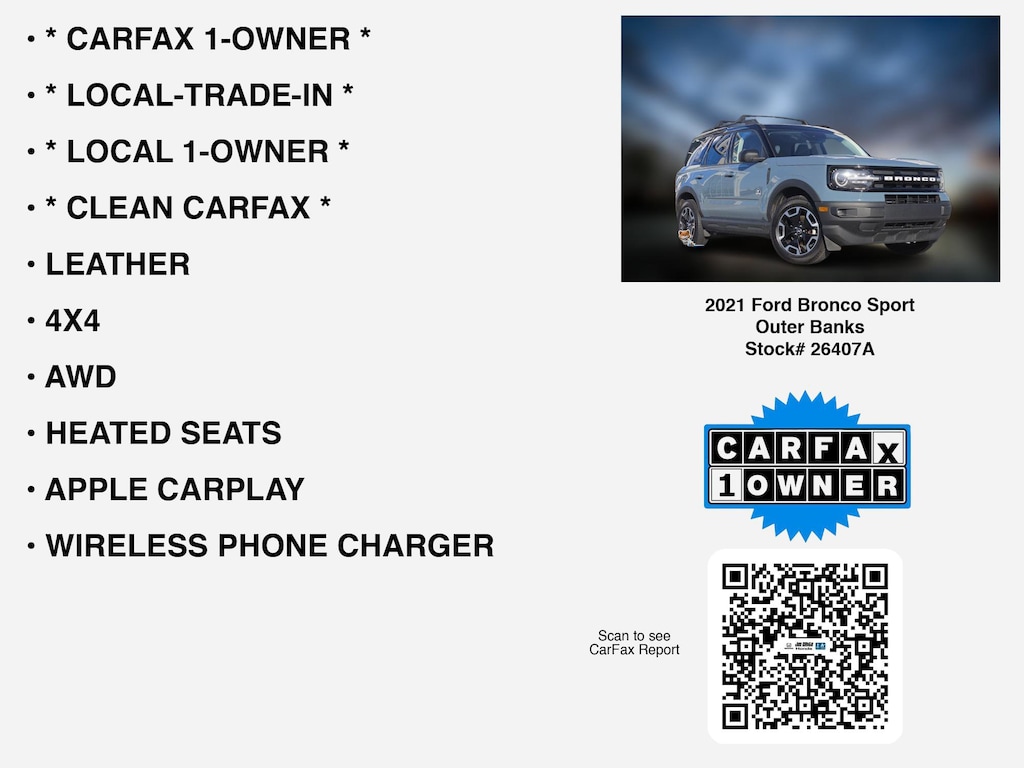 Please call 419-740-4925 anytime! for more info on this 2021 Ford Bronco Sport Outer Banks. This Carfax 1 owner car for sale is packed with premium features like * LOCAL 1-OWNER *, * CLEAN CARFAX *, * LOCAL-TRADE-IN *, * CARFAX 1-OWNER *, LEATHER, AWD, 4X4, HEATED SEATS, APPLE CARPLAY, REMOTE START, WIRELESS PHONE CHARGER, ANDROID AUTO, LANE-DEPARTURE WARNING, BLIND SPOT MONITORING, REAR A/C, HEATED-STEERING WHEEL, TURBO, ALLOY-WHEELS, BACKUP CAMERA, BACKUP-SENSORS, BLUETOOTH, GREAT COLOR COMBINATION, WiFi Hotspot, SiriusXM, Fog Lamps, Remote entry, Dual Power Seats, usb that Toledo and Perrysburg drivers expect.