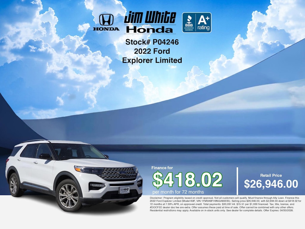 Disclaimer: Disclaimer: Program eligibility based on credit approval. Not all customers will qualify. Must finance through Ally Loan. Finance this 2022 Ford Explorer Limited (Model K8F, VIN 1FMSK8FH9NGA80035). Selling price $26,946.00, with $2,694.00 down at $418.02 for 72 months at 7.39% APR, on approved credit. Total payments: $30,097.44. $15.51 per $1,000 financed. Tax, title, license, and #DOCFEE dealer doc fee are extra. Offer assumes these paid at time of sale. Offer cannot be combined with any other offers. Residential restrictions may apply. Available on in-stock units only. See dealer for complete details. Offer Expires: 04/30/2026.