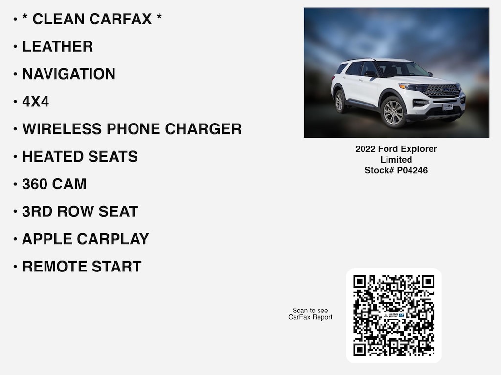 Please call 419-740-4925 anytime! for more info on this 2022 Ford Explorer Limited. This vehicle for sale is packed with premium features like * CLEAN CARFAX *, 4X4, LEATHER, NAVIGATION, WIRELESS PHONE CHARGER, 3RD ROW SEAT, HEATED SEATS, COOLED SEATS, 360 CAM, APPLE CARPLAY, REMOTE START, ANDROID AUTO, LANE-DEPARTURE WARNING, HEATED-REAR SEATS, ALLOY-WHEELS, BACKUP CAMERA, TURBO, 2ND ROW CAPTAINS CHAIRS, HOMELINK, HEATED-STEERING WHEEL, BLIND SPOT MONITORING, STOW "N GO, BLUETOOTH, BACKUP-SENSORS, WiFi Hotspot, usb, SiriusXM, Dual Power Seats, Remote entry, Fog Lamps that Toledo and Perrysburg drivers expect.