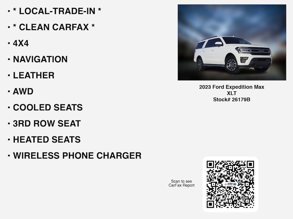 Please call 419-740-4925 anytime! for more info on this 2023 Ford Expedition Max XLT. This vehicle for sale is packed with premium features like * LOCAL-TRADE-IN *, * CLEAN CARFAX *, 4X4, AWD, LEATHER, NAVIGATION, HEATED SEATS, APPLE CARPLAY, 3RD ROW SEAT, COOLED SEATS, WIRELESS PHONE CHARGER, REMOTE START, ANDROID AUTO, LANE-DEPARTURE WARNING, BACKUP CAMERA, HOMELINK, RUNNING-BOARDS, ALLOY-WHEELS, HEATED-STEERING WHEEL, TURBO, BLIND SPOT MONITORING, BLUETOOTH, BACKUP-SENSORS, STOW "N GO, WiFi Hotspot, Dual Power Seats, usb, SiriusXM, Remote entry that Toledo and Perrysburg drivers expect.