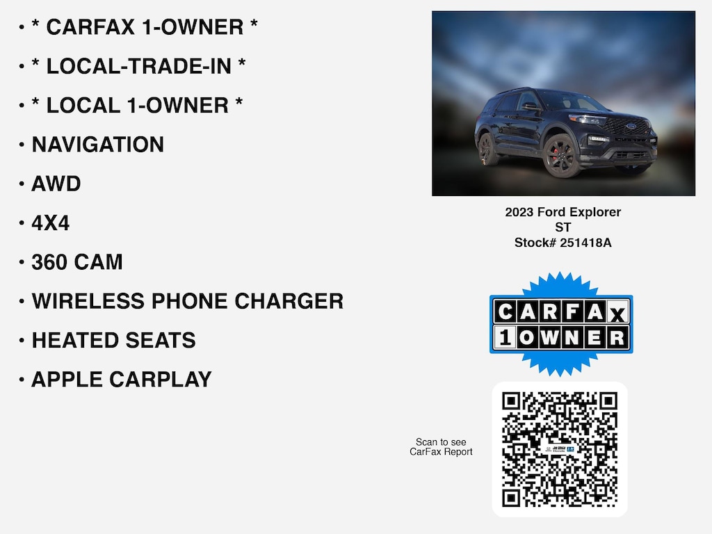 Please call 419-740-4925 anytime! for more info on this 2023 Ford Explorer ST. This Carfax 1 owner car for sale is packed with premium features like * CARFAX 1-OWNER *, * LOCAL 1-OWNER *, * LOCAL-TRADE-IN *, 4X4, NAVIGATION, AWD, WIRELESS PHONE CHARGER, 360 CAM, 3RD ROW SEAT, REMOTE START, HEATED SEATS, COOLED SEATS, APPLE CARPLAY, HEATED-REAR SEATS, TOW PKG, ANDROID AUTO, LANE-DEPARTURE WARNING, BLIND SPOT MONITORING, HEATED-STEERING WHEEL, HOMELINK, ALLOY-WHEELS, TURBO, BACKUP CAMERA, BACKUP-SENSORS, STOW "N GO, BLUETOOTH, usb, Remote entry, Fog Lamps, SiriusXM, Dual Power Seats that Toledo and Perrysburg drivers expect.