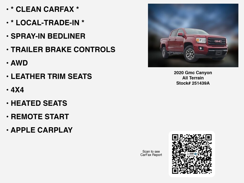 Please call 419-740-4925 anytime! for more info on this 2020 Gmc Canyon All Terrain. * CLEAN CARFAX *, * LOCAL-TRADE-IN *, LEATHER TRIM SEATS, AWD, TRAILER BRAKE CONTROLS, SPRAY-IN BEDLINER, 4X4, APPLE CARPLAY, REMOTE START, HEATED SEATS, ANDROID AUTO, TOW PKG, BED-LINER, ALLOY-WHEELS, TONNEAU-COVER, HEATED-STEERING WHEEL, BACKUP CAMERA, RUNNING-BOARDS, BLUETOOTH, WiFi Hotspot, SiriusXM, Remote entry, Dual Power Seats, usb, Fog Lamps that Toledo and Perrysburg drivers expect.