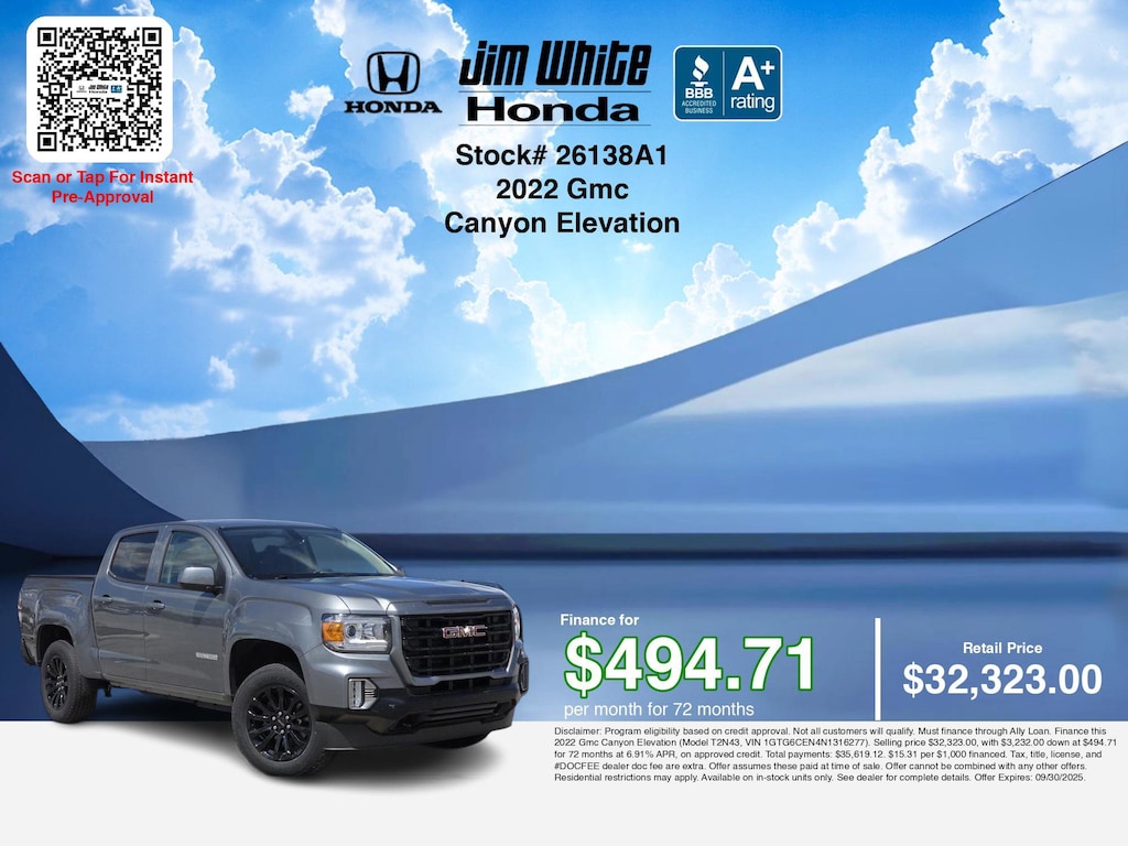 Disclaimer: Disclaimer: Program eligibility based on credit approval. Not all customers will qualify. Must finance through Ally Loan. Finance this 2022 Gmc Canyon Elevation (Model T2N43, VIN 1GTG6CEN4N1316277). Selling price $32,323.00, with $3,232.00 down at $494.71 for 72 months at 6.91% APR, on approved credit. Total payments: $35,619.12. $15.31 per $1,000 financed. Tax, title, license, and #DOCFEE dealer doc fee are extra. Offer assumes these paid at time of sale. Offer cannot be combined with any other offers. Residential restrictions may apply. Available on in-stock units only. See dealer for complete details. Offer Expires: 09/30/2025.