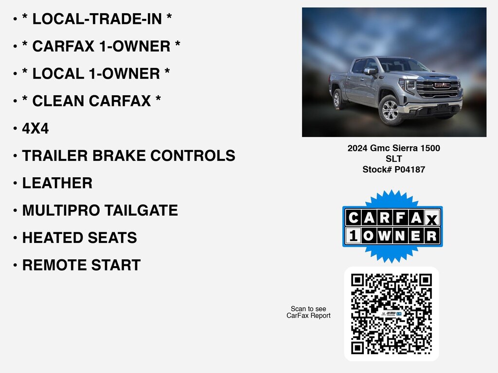 Please call 419-740-4925 anytime! for more info on this 2024 Gmc Sierra 1500 SLT. This Carfax 1 owner car for sale is packed with premium features like * CLEAN CARFAX *, * CARFAX 1-OWNER *, * LOCAL 1-OWNER *, * LOCAL-TRADE-IN *, 4X4, TRAILER BRAKE CONTROLS, LEATHER, MULTIPRO TAILGATE, HEATED SEATS, APPLE CARPLAY, REMOTE START, LANE-DEPARTURE WARNING, TOW PKG, ANDROID AUTO, REAR A/C, ALLOY-WHEELS, BED-LINER, HEATED-STEERING WHEEL, BACKUP CAMERA, BLUETOOTH, WiFi Hotspot, SiriusXM, Fog Lamps, usb, Tailgate-Step, Remote entry, Dual Power Seats that Toledo and Perrysburg drivers expect.