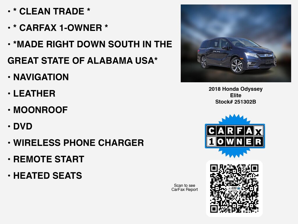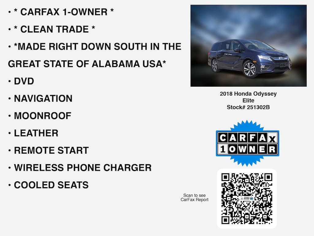 Please call 419-740-4925 anytime! for more info on this 2018 Honda Odyssey Elite. This Carfax 1 owner car for sale is packed with premium features like * CLEAN TRADE *, * CARFAX 1-OWNER *, *MADE RIGHT DOWN SOUTH IN THE GREAT STATE OF ALABAMA USA*, NAVIGATION, LEATHER, DVD, MOONROOF, APPLE CARPLAY, HEATED SEATS, COOLED SEATS, REMOTE START, 3RD ROW SEAT, WIRELESS PHONE CHARGER, LANE-DEPARTURE WARNING, ANDROID AUTO, BLUE-RAY, ALLOY-WHEELS, POWER REAR LIFT GATE, HOMELINK, 2ND ROW CAPTAINS CHAIRS, HEATED-STEERING WHEEL, BACKUP CAMERA, BLIND SPOT MONITORING, BACKUP-SENSORS, POWER SLIDING DOORS, BLUETOOTH, STOW "N GO, WiFi Hotspot, Dual Power Seats, Remote entry, SiriusXM, Fog Lamps, usb that Toledo and Perrysburg drivers expect.