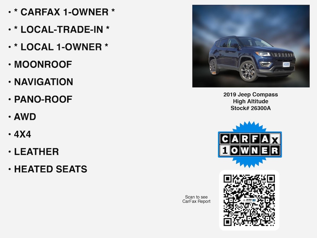 Please call 419-740-4925 anytime! for more info on this 2019 Jeep Compass High Altitude. This Carfax 1 owner car for sale is packed with premium features like * CARFAX 1-OWNER *, * LOCAL-TRADE-IN *, * LOCAL 1-OWNER *, PANO-ROOF, NAVIGATION, LEATHER, 4X4, MOONROOF, AWD, APPLE CARPLAY, REMOTE START, HEATED SEATS, ANDROID AUTO, BLIND SPOT MONITORING, ALLOY-WHEELS, BACKUP CAMERA, REAR A/C, HEATED-STEERING WHEEL, BLUETOOTH, BACKUP-SENSORS, SiriusXM, Remote entry, Fog Lamps that Toledo and Perrysburg drivers expect.