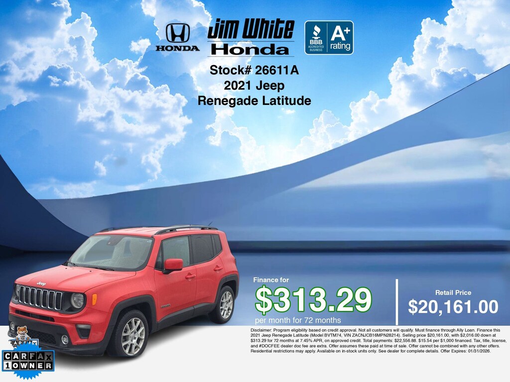 Disclaimer: Disclaimer: Program eligibility based on credit approval. Not all customers will qualify. Must finance through Ally Loan. Finance this 2021 Jeep Renegade Latitude (Model BVTM74, VIN ZACNJCB16MPN28214). Selling price $20,161.00, with $2,016.00 down at $313.29 for 72 months at 7.45% APR, on approved credit. Total payments: $22,556.88. $15.54 per $1,000 financed. Tax, title, license, and #DOCFEE dealer doc fee are extra. Offer assumes these paid at time of sale. Offer cannot be combined with any other offers. Residential restrictions may apply. Available on in-stock units only. See dealer for complete details. Offer Expires: 01/31/2026.
