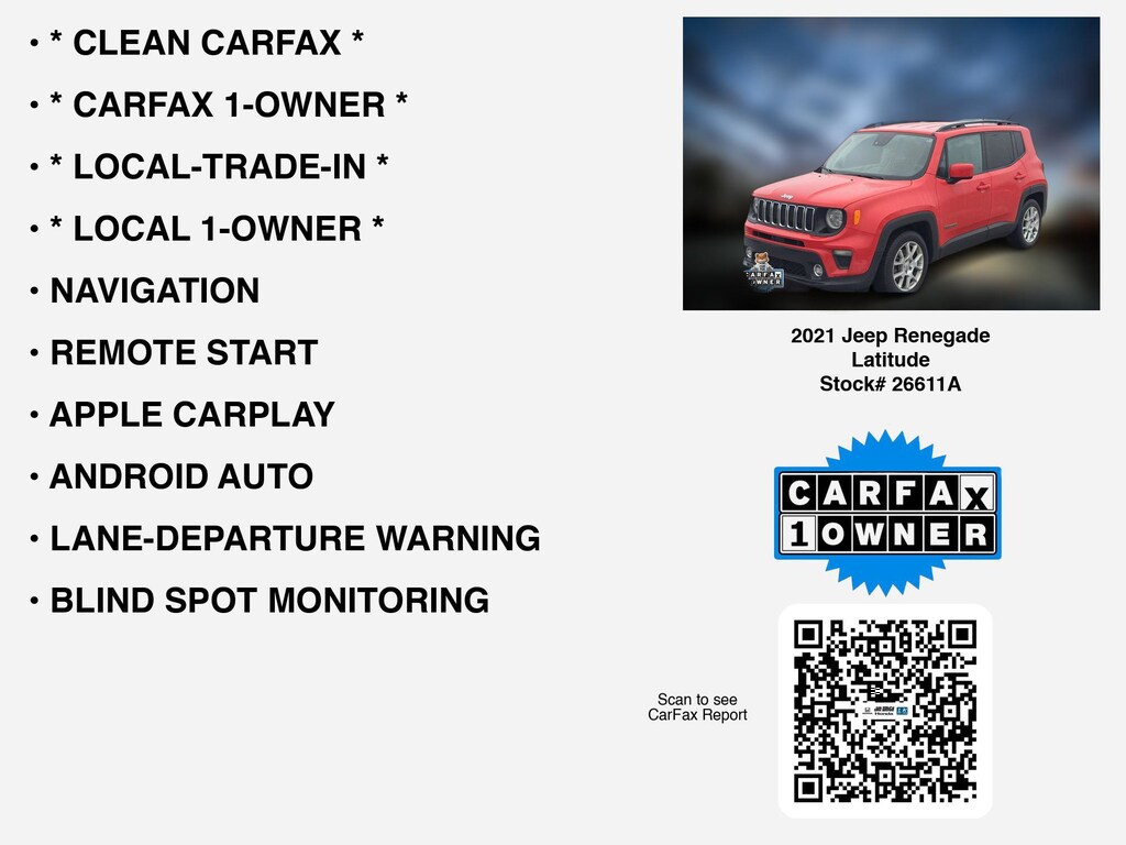 Please call 419-740-4925 anytime! for more info on this 2021 Jeep Renegade Latitude. This vehicle for sale is packed with premium features like * LOCAL-TRADE-IN *, * CLEAN CARFAX *, * CARFAX 1-OWNER *, * LOCAL 1-OWNER *, NAVIGATION, REMOTE START, APPLE CARPLAY, LANE-DEPARTURE WARNING, ANDROID AUTO, BACKUP CAMERA, TURBO, ALLOY-WHEELS, BLIND SPOT MONITORING, BLUETOOTH, Fog Lamps, Remote entry, usb, SiriusXM that Toledo and Perrysburg drivers expect.