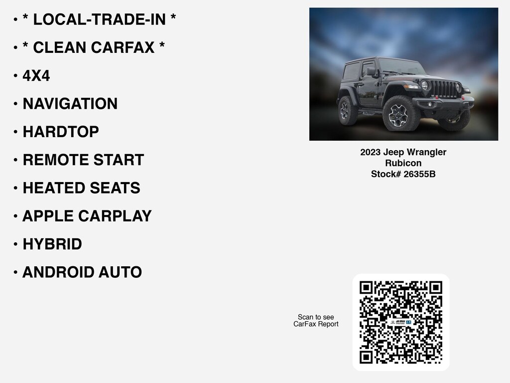 Please call 419-740-4925 anytime! for more info on this 2023 Jeep Wrangler Rubicon. This vehicle for sale is packed with premium features like * CLEAN CARFAX *, * LOCAL-TRADE-IN *, 4X4, NAVIGATION, HYBRID, REMOTE START, APPLE CARPLAY, HARDTOP, HEATED SEATS, ANDROID AUTO, ALLOY-WHEELS, RUNNING-BOARDS, HOMELINK, BACKUP CAMERA, REAR A/C, HEATED-STEERING WHEEL, BLUETOOTH, GREAT COLOR COMBINATION, WiFi Hotspot, SiriusXM, Remote entry, Fog Lamps, usb that Toledo and Perrysburg drivers expect.