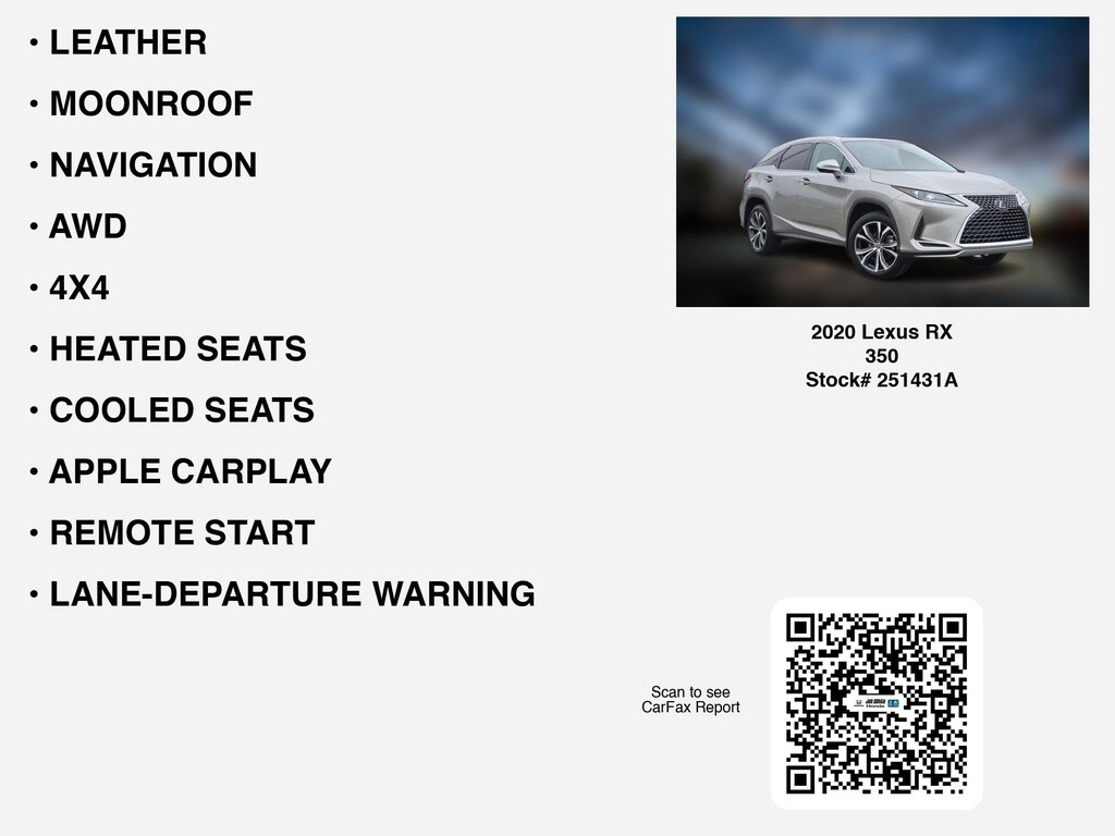 Please call 419-740-4925 anytime! for more info on this 2020 Lexus RX 350. LEATHER, NAVIGATION, 4X4, AWD, MOONROOF, REMOTE START, COOLED SEATS, APPLE CARPLAY, HEATED SEATS, ANDROID AUTO, LANE-DEPARTURE WARNING, HEATED-STEERING WHEEL, REAR A/C, HOMELINK, BACKUP CAMERA, BLIND SPOT MONITORING, ALLOY-WHEELS, BLUETOOTH, BACKUP-SENSORS, WiFi Hotspot, Remote entry, Dual Power Seats, SiriusXM, usb that Toledo and Perrysburg drivers expect.