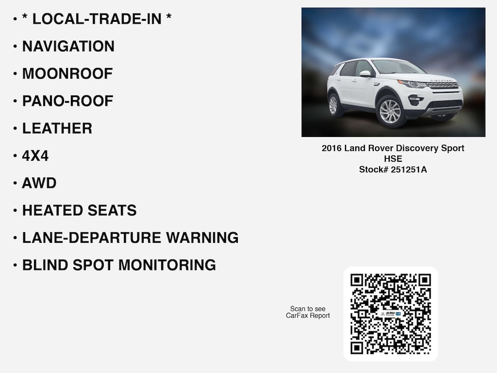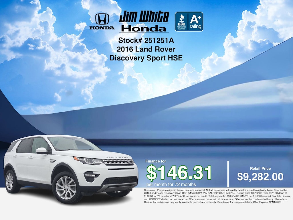 Disclaimer: Disclaimer: Program eligibility based on credit approval. Not all customers will qualify. Must finance through Ally Loan. Finance this 2016 Land Rover Discovery Sport HSE (Model IUTV, VIN SALCR2BG5GH552204). Selling price $9,282.00, with $928.00 down at $146.31 for 72 months at 7.96% APR, on approved credit. Total payments: $10,534.32. $15.76 per $1,000 financed. Tax, title, license, and #DOCFEE dealer doc fee are extra. Offer assumes these paid at time of sale. Offer cannot be combined with any other offers. Residential restrictions may apply. Available on in-stock units only. See dealer for complete details. Offer Expires: 12/31/2025.