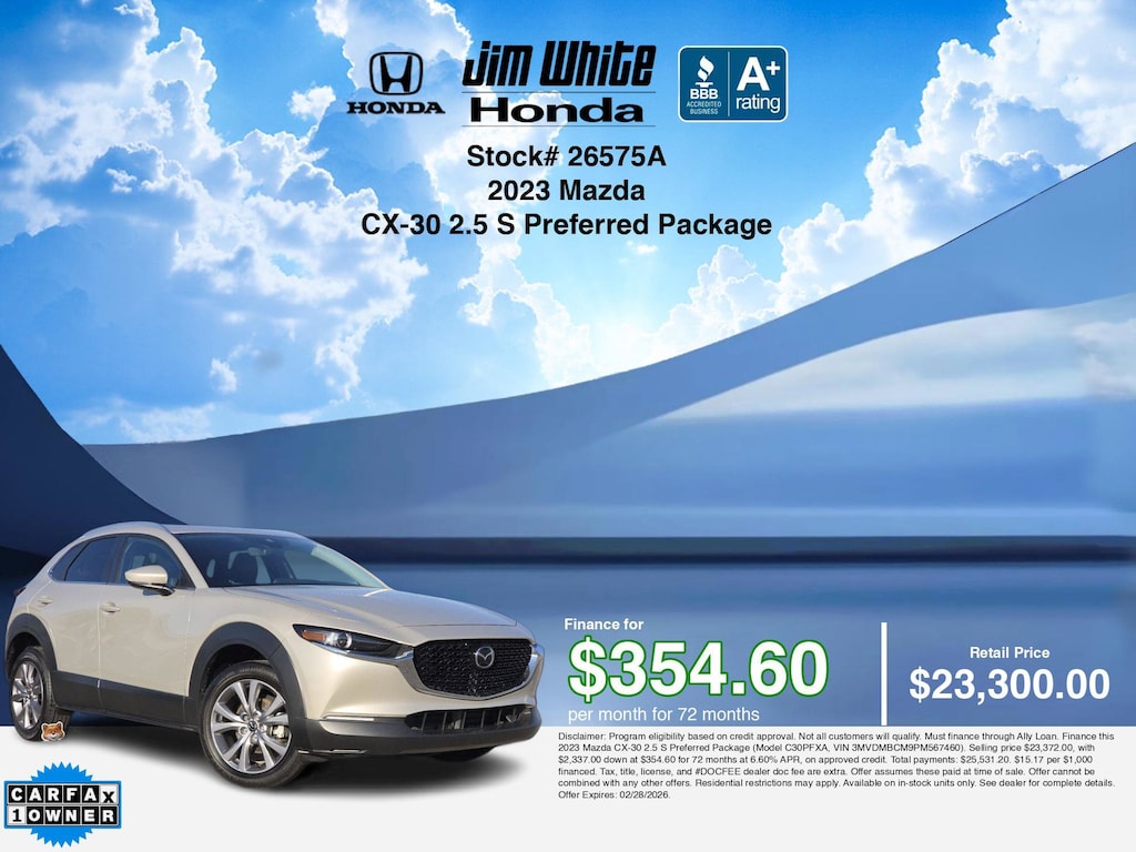 Disclaimer: Disclaimer: Program eligibility based on credit approval. Not all customers will qualify. Must finance through Ally Loan. Finance this 2023 Mazda CX-30 2.5 S Preferred Package (Model C30PFXA, VIN 3MVDMBCM9PM567460). Selling price $23,372.00, with $2,337.00 down at $354.60 for 72 months at 6.60% APR, on approved credit. Total payments: $25,531.20. $15.17 per $1,000 financed. Tax, title, license, and #DOCFEE dealer doc fee are extra. Offer assumes these paid at time of sale. Offer cannot be combined with any other offers. Residential restrictions may apply. Available on in-stock units only. See dealer for complete details. Offer Expires: 02/28/2026.