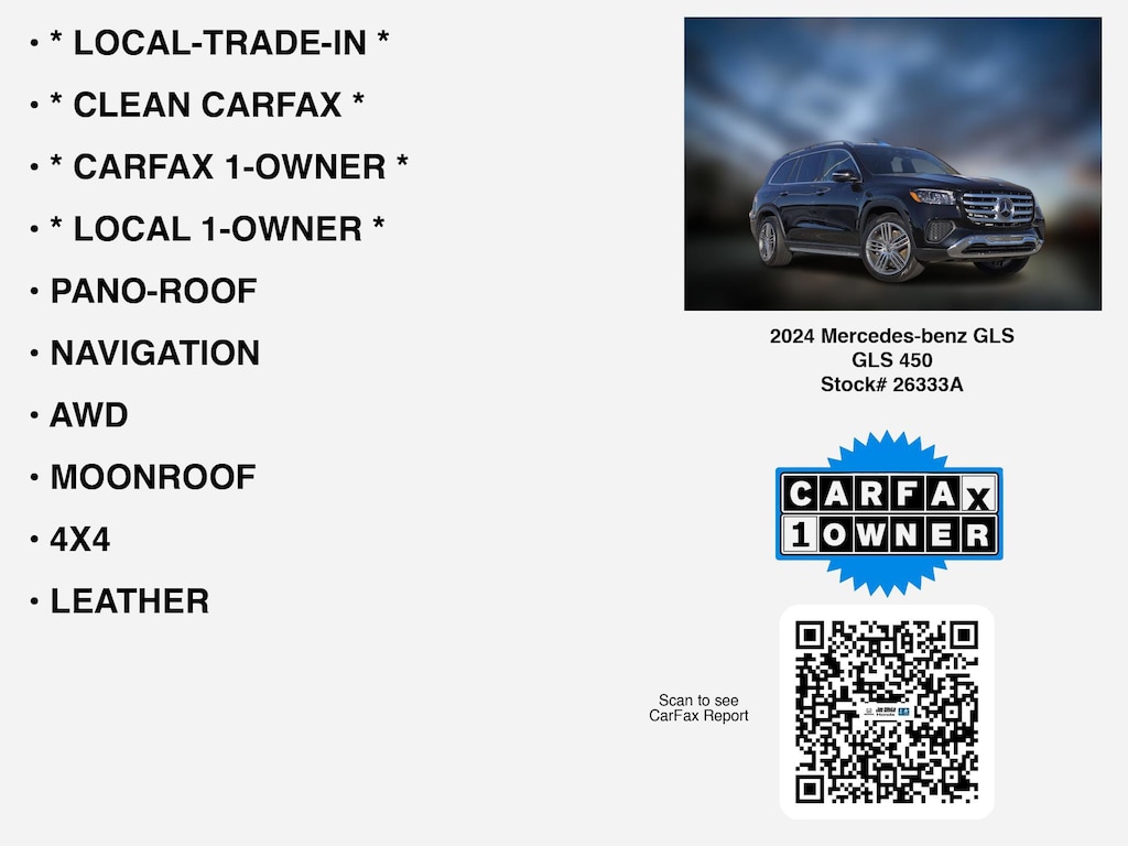 Please call 419-740-4925 anytime! for more info on this 2024 Mercedes-benz GLS GLS 450. This vehicle for sale is packed with premium features like * LOCAL 1-OWNER *, * CARFAX 1-OWNER *, * CLEAN CARFAX *, * LOCAL-TRADE-IN *, PANO-ROOF, LEATHER, AWD, MOONROOF, NAVIGATION, 4X4, 3RD ROW SEAT, APPLE CARPLAY, HEATED SEATS, 360 CAM, COOLED SEATS, HYBRID, WIRELESS PHONE CHARGER, LANE-DEPARTURE WARNING, ANDROID AUTO, BACKUP CAMERA, REAR A/C, TURBO, BLIND SPOT MONITORING, ALLOY-WHEELS, HOMELINK, 2ND ROW CAPTAINS CHAIRS, BLUETOOTH, BACKUP-SENSORS, STOW "N GO, WiFi Hotspot, Dual Power Seats, SiriusXM, usb, Remote entry that Toledo and Perrysburg drivers expect.