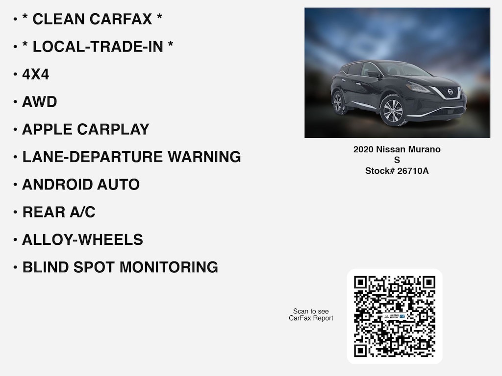 Please call 419-740-4925 anytime! for more info on this 2020 Nissan Murano S. * CLEAN CARFAX *, * LOCAL-TRADE-IN *, AWD, 4X4, APPLE CARPLAY, ANDROID AUTO, LANE-DEPARTURE WARNING, REAR A/C, BACKUP CAMERA, BLIND SPOT MONITORING, ALLOY-WHEELS, BACKUP-SENSORS, BLUETOOTH, SiriusXM, usb, Remote entry that Toledo and Perrysburg drivers expect.