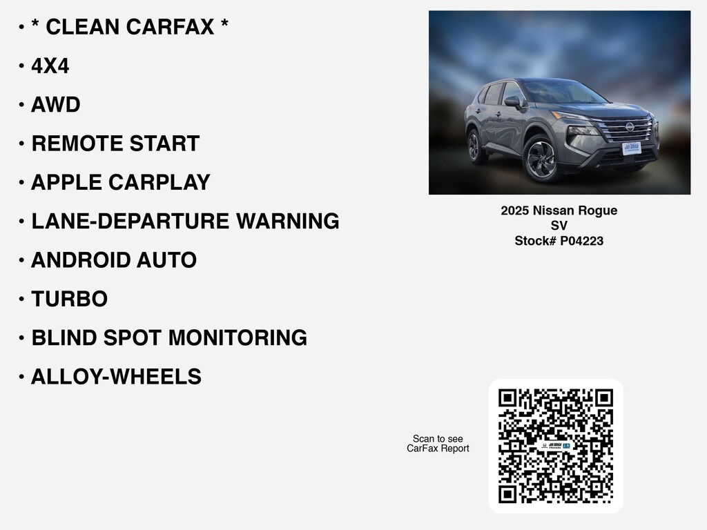 Disclaimer: Disclaimer: Program eligibility based on credit approval. Not all customers will qualify. Must finance through Ally Loan. Finance this 2025 Nissan Rogue SV (Model 22215, VIN 5N1BT3BB3SC768245). Selling price $23,494.00, with $2,349.00 down at $356.26 for 72 months at 6.58% APR, on approved credit. Total payments: $25,650.72. $15.16 per $1,000 financed. Tax, title, license, and #DOCFEE dealer doc fee are extra. Offer assumes these paid at time of sale. Offer cannot be combined with any other offers. Residential restrictions may apply. Available on in-stock units only. See dealer for complete details. Offer Expires: 01/31/2026.