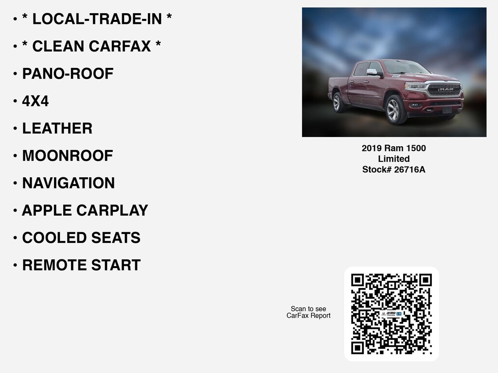 Please call 419-740-4925 anytime! for more info on this 2019 Ram 1500 Limited. * CLEAN CARFAX *, * LOCAL-TRADE-IN *, NAVIGATION, 4X4, MOONROOF, PANO-ROOF, LEATHER, REMOTE START, APPLE CARPLAY, HEATED SEATS, COOLED SEATS, LANE-DEPARTURE WARNING, TOW PKG, ANDROID AUTO, HEATED-REAR SEATS, BACKUP CAMERA, HEATED-STEERING WHEEL, BLIND SPOT MONITORING, TONNEAU-COVER, BLUETOOTH, BACKUP-SENSORS that Toledo and Perrysburg drivers expect.