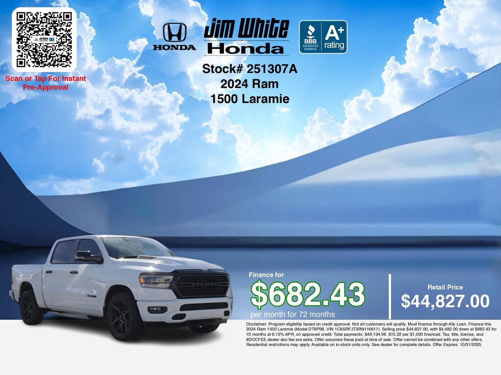 Disclaimer: Disclaimer: Program eligibility based on credit approval. Not all customers will qualify. Must finance through Ally Loan. Finance this 2024 Ram 1500 Laramie (Model DT6P98, VIN 1C6SRFJT3RN116617). Selling price $44,827.00, with $4,482.00 down at $682.43 for 72 months at 6.72% APR, on approved credit. Total payments: $49,134.96. $15.22 per $1,000 financed. Tax, title, license, and #DOCFEE dealer doc fee are extra. Offer assumes these paid at time of sale. Offer cannot be combined with any other offers. Residential restrictions may apply. Available on in-stock units only. See dealer for complete details. Offer Expires: 10/31/2025.