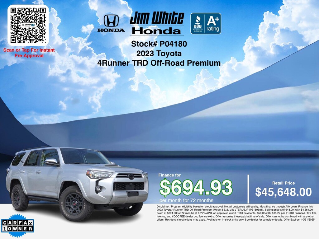 Disclaimer: Disclaimer: Program eligibility based on credit approval. Not all customers will qualify. Must finance through Ally Loan. Finance this 2023 Toyota 4Runner TRD Off-Road Premium (Model 8672, VIN JTERU5JR4P6189681). Selling price $45,648.00, with $4,564.00 down at $694.93 for 72 months at 6.72% APR, on approved credit. Total payments: $50,034.96. $15.22 per $1,000 financed. Tax, title, license, and #DOCFEE dealer doc fee are extra. Offer assumes these paid at time of sale. Offer cannot be combined with any other offers. Residential restrictions may apply. Available on in-stock units only. See dealer for complete details. Offer Expires: 10/31/2025.