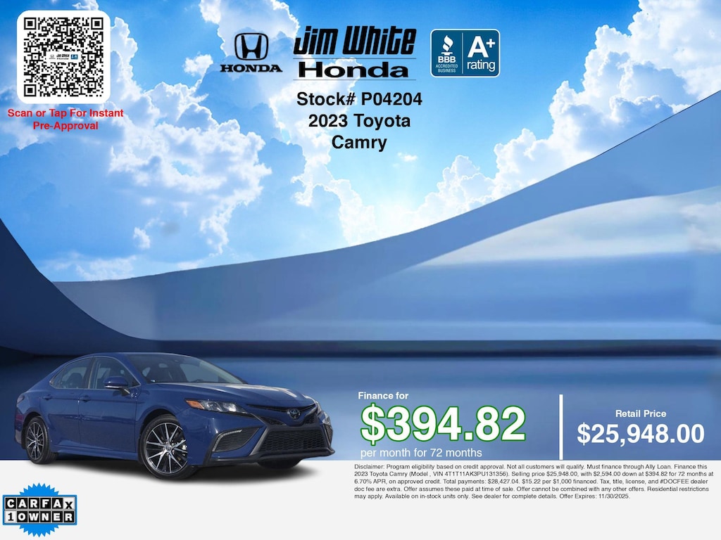 Disclaimer: Disclaimer: Program eligibility based on credit approval. Not all customers will qualify. Must finance through Ally Loan. Finance this 2023 Toyota Camry (Model , VIN 4T1T11AK3PU131356). Selling price $25,948.00, with $2,594.00 down at $394.82 for 72 months at 6.70% APR, on approved credit. Total payments: $28,427.04. $15.22 per $1,000 financed. Tax, title, license, and #DOCFEE dealer doc fee are extra. Offer assumes these paid at time of sale. Offer cannot be combined with any other offers. Residential restrictions may apply. Available on in-stock units only. See dealer for complete details. Offer Expires: 11/30/2025.